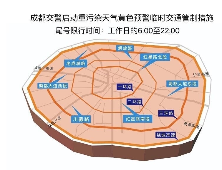 二、工作日的6:00至22:00,禁止國(guó)Ⅲ(不含)以下排放標(biāo)準(zhǔn)的汽油車和國(guó)Ⅲ(含)以下排放標(biāo)準(zhǔn)的柴油車(特殊車輛除外)在四環(huán)路(成都繞城高速公路G4202,不含)以內(nèi)道路上行駛。