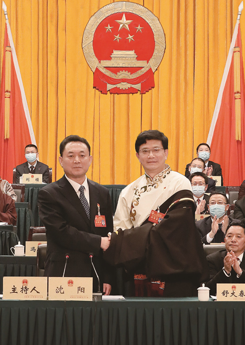 州十三屆人大一次會議上,州委書記沈陽向當選的州人民政府州長馮發(fā)貴表示祝賀。