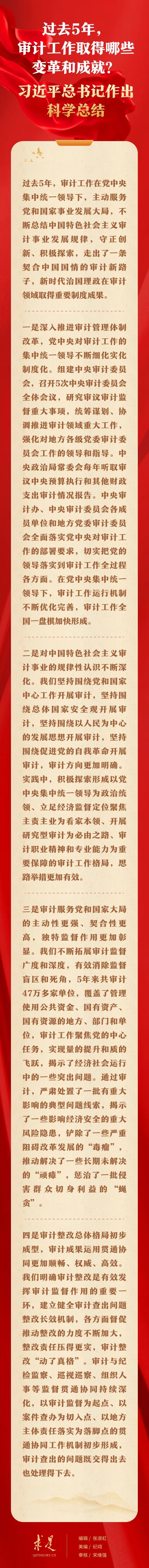 11月1日出版的第21期《求是》雜志刊發(fā)習(xí)近平總書記重要文章《在二十屆中央審計(jì)委員會(huì)第一次會(huì)議上的講話》。在這篇重要文章中,習(xí)近平總書記從4個(gè)方面對(duì)過去5年的審計(jì)工作進(jìn)行科學(xué)總結(jié),強(qiáng)調(diào):“審計(jì)工作取得的這些變革和成就,是新時(shí)代中國(guó)特色社會(huì)主義思想在審計(jì)領(lǐng)域的具體實(shí)踐,彰顯了黨的創(chuàng)新理論的真理力量,具有鮮明的時(shí)代性和實(shí)踐性。要總結(jié)好、運(yùn)用好黨關(guān)于新時(shí)代審計(jì)工作的理論成果和實(shí)踐成果,長(zhǎng)期堅(jiān)持并不斷豐富發(fā)展,指導(dǎo)審計(jì)工作實(shí)現(xiàn)更大作為?!?/p>