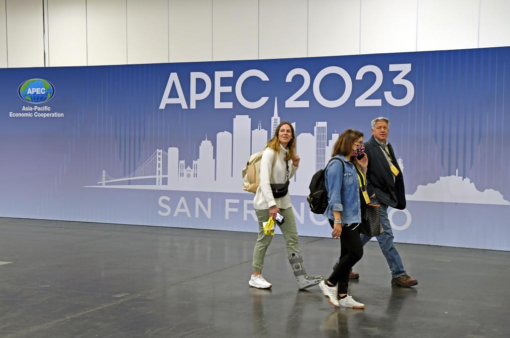 11月12日,在美國舊金山,記者經(jīng)過2023年亞太經(jīng)合組織會議國際媒體中心內(nèi)的一幅海報。新華社記者李睿 攝