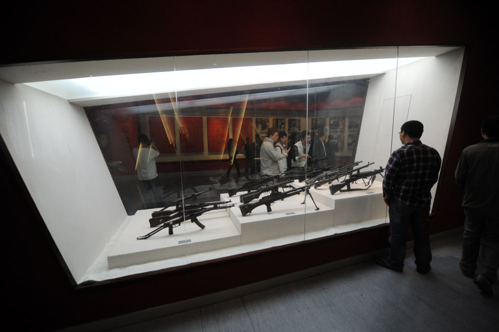 ↑ 觀眾在鹽城新四軍紀(jì)念館內(nèi)參觀槍支等實(shí)物展品(2011年5月26日攝)。
