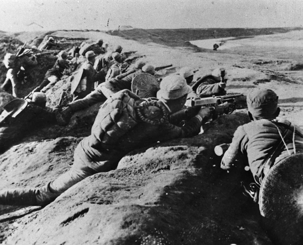 ↑ 新四軍戰(zhàn)士在馬家園戰(zhàn)斗中射擊敵人。