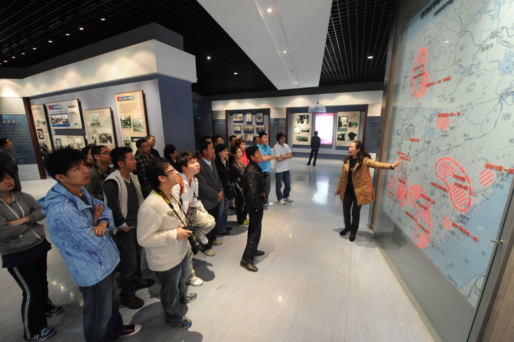 ↑ 在鹽城新四軍紀(jì)念館內(nèi),講解員在向觀眾介紹南方紅軍游擊隊(duì)整編為新四軍示意圖(2011年5月26日攝)。