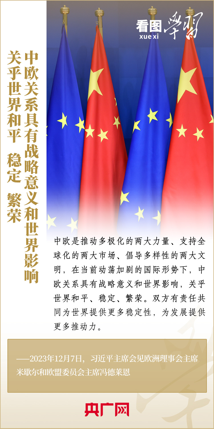 12月7日,國家主席習(xí)近平會見來華舉行第二十四次中國—歐盟領(lǐng)導(dǎo)人會晤的歐洲理事會主席米歇爾和歐盟委員會主席馮德萊恩,雙方就事關(guān)中歐關(guān)系的戰(zhàn)略性問題,以及中歐各領(lǐng)域?qū)υ捄献鳌㈦p方重點關(guān)切、全球治理、國際和地區(qū)熱點問題等深入坦誠交換看法,并就一系列問題達成重要共識。今年是中歐建立全面戰(zhàn)略伙伴關(guān)系20周年,習(xí)主席強調(diào),中歐關(guān)系具有戰(zhàn)略意義和世界影響,關(guān)乎世界和平、穩(wěn)定、繁榮。一起來學(xué)習(xí)!