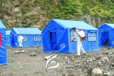 衛(wèi)生防疫人員對安置點進行消毒。
