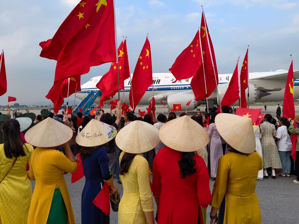離開河內(nèi)赴機(jī)場(chǎng)途中,當(dāng)?shù)孛癖姾腿A僑華人聚集在道路兩旁,揮舞中越兩國國旗,熱烈歡送習(xí)近平總書記,并祝賀訪問取得圓滿成功。