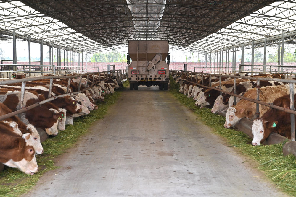 12月13日,在來(lái)賓市興賓區(qū)大灣鎮(zhèn)雙誠(chéng)牧業(yè)有限公司,工人駕駛車輛給牛投撒以甘蔗尾葉為主要原料的飼料。