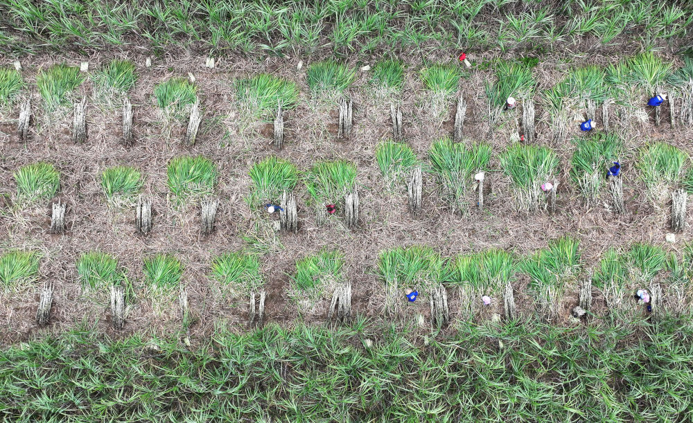 12月12日,在來(lái)賓市興賓區(qū)小平陽(yáng)鎮(zhèn),農(nóng)民在收割甘蔗(無(wú)人機(jī)照片)。