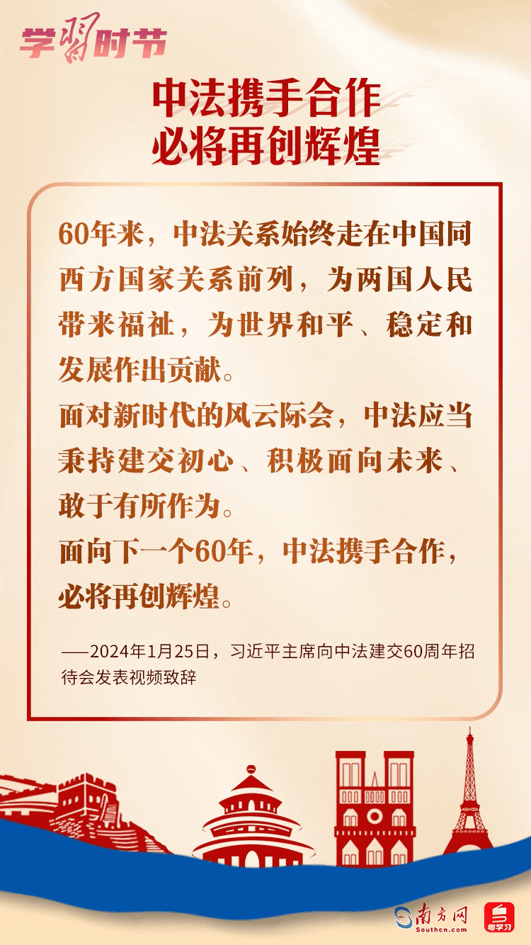 1月27日,國家主席習(xí)近平同法國總統(tǒng)馬克龍互致賀電,慶祝兩國建交60周年。習(xí)近平主席指出,60年前,中法打破冷戰(zhàn)堅(jiān)冰、跨越陣營鴻溝,建立大使級外交關(guān)系。兩國關(guān)系創(chuàng)造多個“第一”、取得豐碩成果,不僅造福于兩國人民,也為維護(hù)世界和平穩(wěn)定、促進(jìn)世界多極化和國際關(guān)系民主化發(fā)揮重要作用。