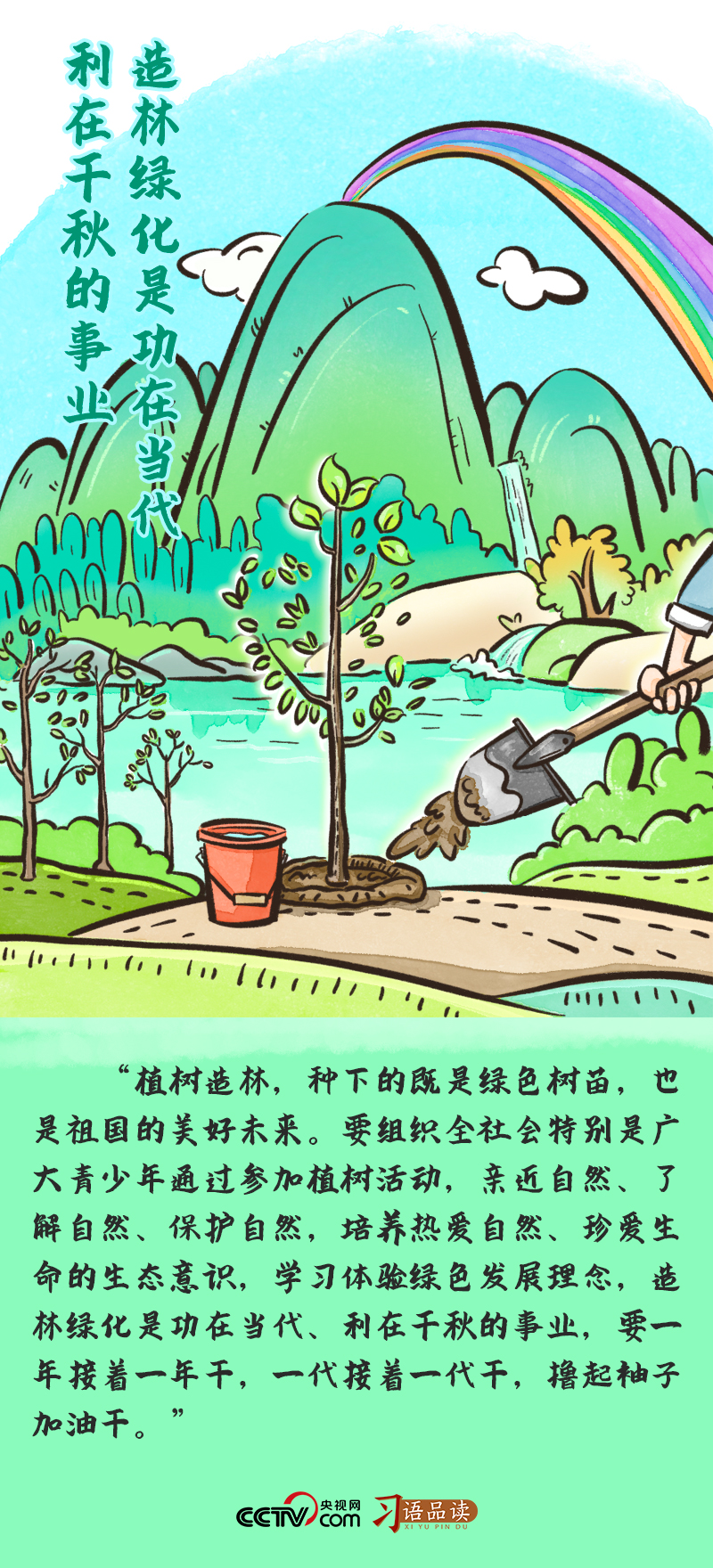其后,總書(shū)記強(qiáng)調(diào)踐行綠色發(fā)展理念,將綠化意識(shí)種進(jìn)下一代心田的重要作用,指明“要組織全社會(huì)特別是廣大青少年通過(guò)參加植樹(shù)活動(dòng)”“要一年接著一年干,一代接著一代干,擼起袖子加油干”等實(shí)施路徑,進(jìn)而實(shí)現(xiàn)“培養(yǎng)熱愛(ài)自然、珍愛(ài)生命的生態(tài)意識(shí)”“學(xué)習(xí)體驗(yàn)綠色發(fā)展理念”的目標(biāo)。