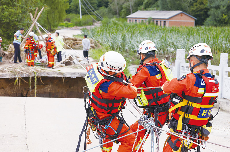 2023年夏,面對影響華北、黃淮、東北等地的嚴重汛情,在以習近平同志為核心的黨中央堅強領導下,廣大黨員干部為守護人民生命和財產(chǎn)安全挺身向前,千千萬萬人民群眾為保衛(wèi)家園頑強奮戰(zhàn)。圖為8月6日,吉林省吉林市消防救援支隊隊員利用繩橋解救受困村民。 新華社記者 顏麟蘊/攝