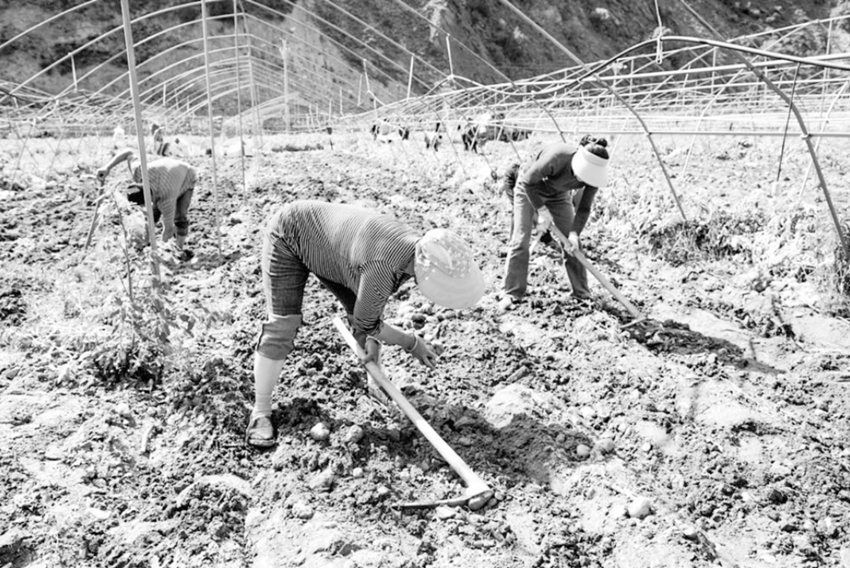 村民在基地挖土豆。