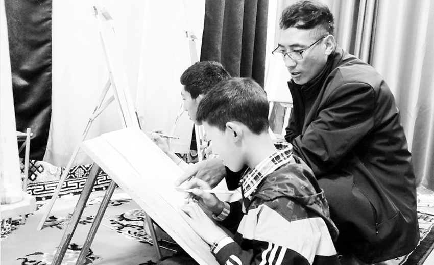 經(jīng)過一段時間的調(diào)整和恢復(fù),幾經(jīng)思考,昂旺西繞決定嘗試用左手重拾畫筆。自學(xué)兩年后,在家人的支持和鼓勵下,踏上了前往西藏學(xué)習(xí)繪制唐卡的道路。從基礎(chǔ)的線條勾勒到給唐卡上色,5年的學(xué)藝生涯里,他不分晝夜、從早到晚地反復(fù)練習(xí),好在有著多年彩繪的經(jīng)驗(yàn),在唐卡繪畫的學(xué)習(xí)上一點(diǎn)就通,克服左手畫畫的困難后,他很快便順利出師回到家鄉(xiāng)并經(jīng)營起繪制唐卡的工作室。