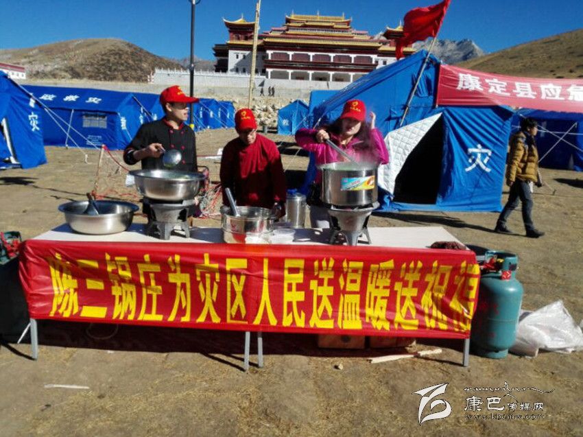 11月28日中午,記者來到康定塔公鎮(zhèn)祖慶小學(xué)采訪。在現(xiàn)場,一群戴著紅帽子的人正在將熱氣騰騰的紅燒肉一勺一勺的分發(fā)到同學(xué)們碗中。仔細(xì)一看,現(xiàn)場還有一幅標(biāo)語,上面寫著“陳三鍋莊為災(zāi)區(qū)人民送溫暖送祝福”的字樣。記者揉了揉眼,確定沒看錯(cuò)。原來,陳三鍋莊是關(guān)了康定的門店,組織人員到災(zāi)區(qū)參與抗震救災(zāi)來了。