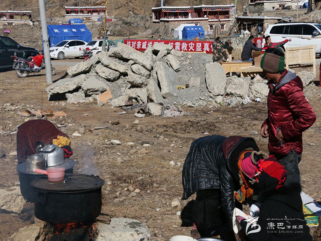 走進八美鎮(zhèn)重災(zāi)區(qū)中古村災(zāi)民安置區(qū),第一眼就能看見戴著紅袖章的兩個村民正圍著兩個大灶轉(zhuǎn)來轉(zhuǎn)去忙個不停。村民巴青老人說:“災(zāi)后,我們隊的村民都集中安置在這里,為方便受災(zāi)群眾和前來幫忙的干部都能喝上一口熱茶,我們幾個村民臨時搭建了兩個‘三鍋莊’灶臺,用來燒清茶和開水,因為我們知道有些干部習(xí)慣喝白開水,就特意準(zhǔn)備了一個燒白開水的鍋。”他指著正在搶修房屋的黨員服務(wù)隊說:“地震發(fā)生到現(xiàn)在,很多領(lǐng)導(dǎo)來看望我們,很多干部到村上幫助搶修房屋、運送物資,這么冷的天,他們一直不停地在幫我們做事情,很辛苦!我們不能光等著干部們來給我們做事情,我今年68歲,雖然做不了大的事,但是給他們燒茶遞水是沒有問題的。”