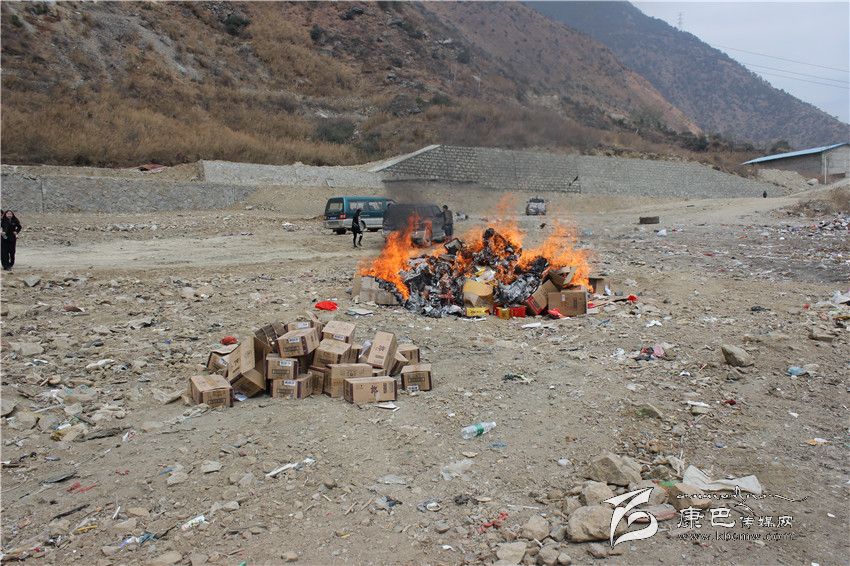 本網(wǎng)訊(謝靜 尼胡克布文/圖)3月15日,瀘定縣食品藥品工商質(zhì)量監(jiān)督管理局聯(lián)合司法局、發(fā)改局、農(nóng)牧局等相關(guān)部門(mén)以及煙草、桑吉卓瑪、瀘灃超市、電信等企業(yè),以“3.15”活動(dòng)為契機(jī),深入開(kāi)展“新消費(fèi),我做主”年主題宣傳活動(dòng),現(xiàn)場(chǎng)接待了各類(lèi)咨詢(xún)150余人(次),發(fā)放各種宣傳材料2000余份。宣傳活動(dòng)結(jié)束后,縣食品藥品工商質(zhì)量監(jiān)督管理局將近期收繳的價(jià)值9.1余萬(wàn)元的不合格食品、侵犯商標(biāo)的商品,運(yùn)送到垃圾場(chǎng)進(jìn)行了焚毀。圖為焚燒現(xiàn)場(chǎng)?! ?br />