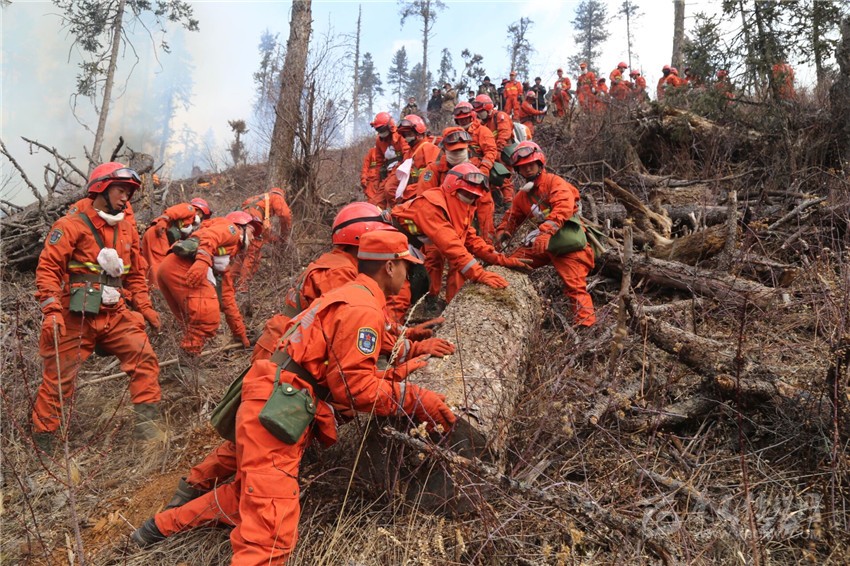 2月10日,甘孜森林支隊(duì)官兵合力清理倒木,防止林火蔓延。 (羅藝鑫 攝)
