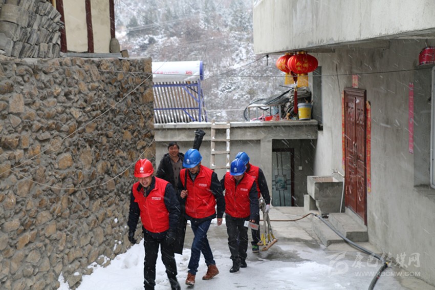 康定市電力公司員工冒雪排查線路故障。