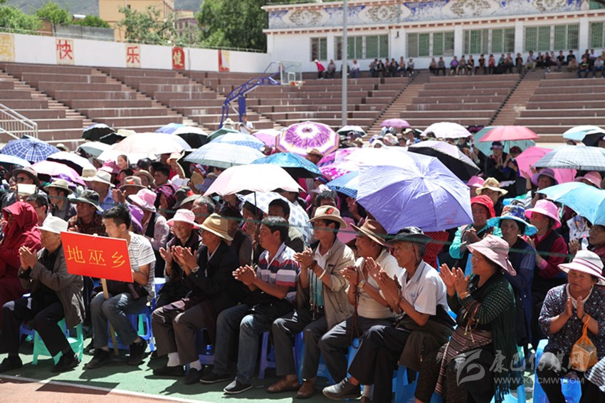 烈日炎炎,然而,比氣溫更高的是群眾的熱度。中午1點過,夏邛鎮(zhèn)、竹巴龍鄉(xiāng)、地巫鄉(xiāng)、康寧寺的機關(guān)干部、群眾、僧侶們便陸續(xù)走進體育中心。