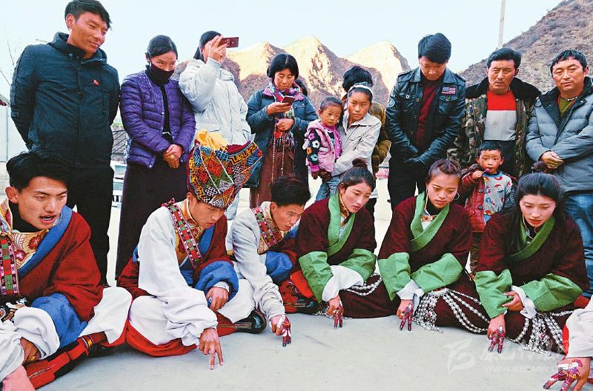 2017年12月22日,白玉縣城陽光普照,縣藝術(shù)團(tuán)一群“90后”藏族演員用顏料相互在食指和中指上熟練地繪制著具有當(dāng)?shù)孛袼滋厣娜宋飯D案。音樂響起,演員們的手指隨著節(jié)拍翩翩起舞,左挪右轉(zhuǎn)。隨著唱詞和曲調(diào)的變化,手指的動作幅度和節(jié)奏也隨之變化。藝人的情感起伏、喜怒哀樂被“小人”般的手指表現(xiàn)得淋漓盡致。
