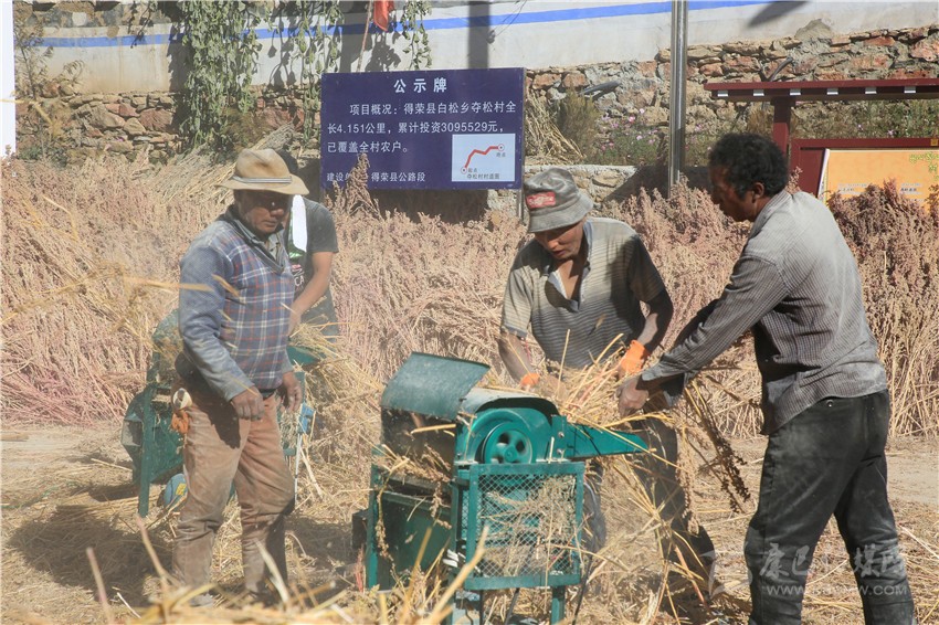 金秋的陽(yáng)光熾熱溫暖,得榮縣白松鎮(zhèn)奪松村一片祥和安寧。11月10日,村民們正在村活動(dòng)室的院壩里脫粒藜麥,豐收的喜悅寫(xiě)在忙碌的村民的臉上?!按蠹壹佑透桑艳见溄唤o公司,立馬可以拿到現(xiàn)錢(qián)?!眾Z松村委會(huì)副主任四郎都遷高興地說(shuō),盤(pán)點(diǎn)收成,今年又是一個(gè)豐收年。