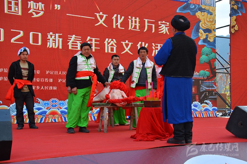 1月11日上午,“瀘定縣2020新春年俗文化活動”在杵坭鄉(xiāng)櫻桃廣場舉行。每到冬月以后,殺年豬這一習(xí)俗總會讓濃濃的年味彌漫在瀘定縣。隨著鑼鼓聲回蕩山間田野,人們歡天喜地,抬著“豬王”一路舞獅打鼓,在人潮的簇擁下來到主舞臺進行祭祀。這樣的習(xí)俗,不僅充滿了年味,更是淳樸鄉(xiāng)情和美好寓意的延續(xù)。