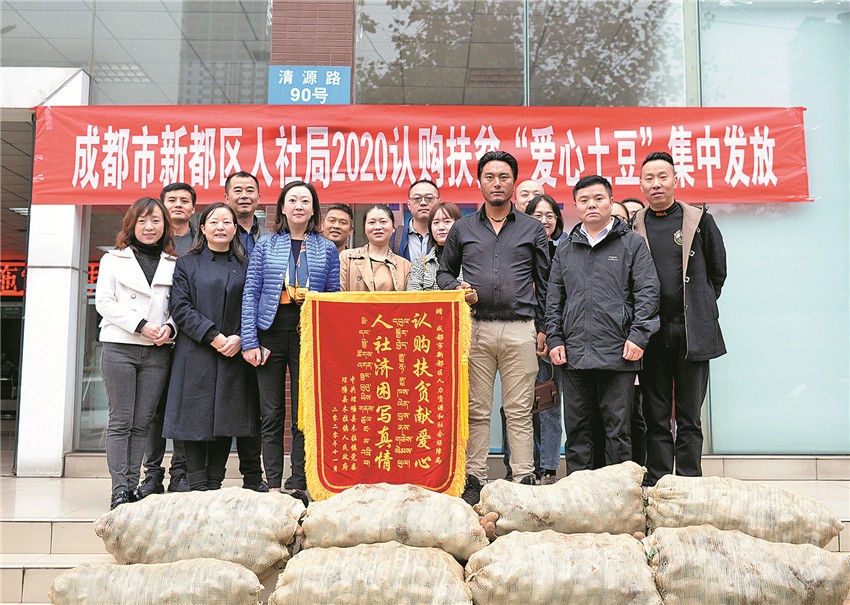 “感謝你們幫助認(rèn)購3萬余斤土豆……扎西德勒!”11月6日上午8點(diǎn)36分,“愛心土豆”車隊(duì)剛在新都區(qū)人社局停車場停穩(wěn),降央吉村一個躍步下車,為等候多時的人社局送上“認(rèn)購扶貧獻(xiàn)愛心、人社濟(jì)困寫真情”的錦旗。