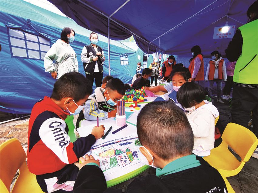 “這頂帳篷中充滿了孩子們的歡聲笑語,這在地震災(zāi)區(qū)就是最動(dòng)聽的聲音?!惫睬鄨F(tuán)甘孜州委統(tǒng)戰(zhàn)社會(huì)聯(lián)絡(luò)部部長(zhǎng)澤仁娜姆介紹,地震發(fā)生后,團(tuán)州委第一時(shí)間組織3193名志愿者,24支青年突擊隊(duì)參與應(yīng)急志愿者工作,并在磨西鎮(zhèn)貢嘎廣場(chǎng)分配38名志愿者參與后勤保障工作,其中5個(gè)人便成為了“青青兒童樂園”里的“保育員”,“孩子們可以在這里畫畫、做游戲,還能在老師輔導(dǎo)下學(xué)習(xí),他們不安的情緒也得到安撫,臉上的恐懼也逐漸被微笑取代?!?/p>