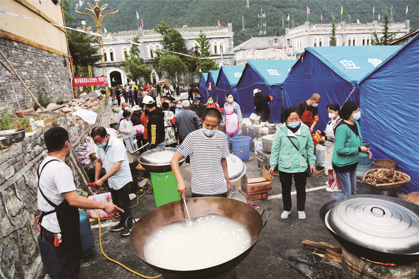 這是來(lái)之不易的“百家飯”,在“9·5”瀘定縣6.8級(jí)地震發(fā)生后,受災(zāi)村民你拿一袋米、我提一筐菜,你出一份力、我捐一點(diǎn)錢(qián),齊心協(xié)力、共渡難關(guān),520人共煮一鍋“團(tuán)結(jié)飯”。