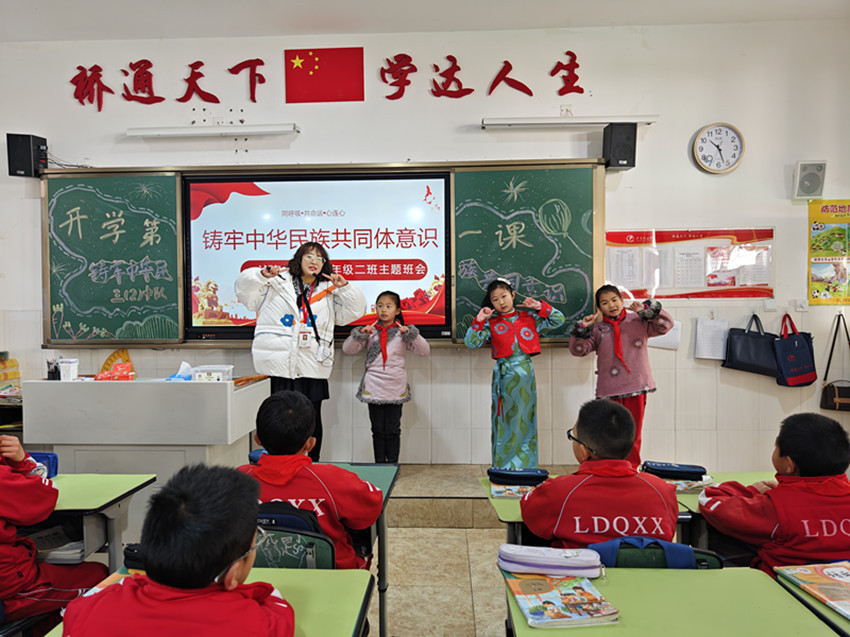 “同學(xué)們,新學(xué)期新起點(diǎn),沐浴著紅城綠谷春的氣息,我們定要同努力、共奮進(jìn),健康成長(zhǎng),揚(yáng)眉‘兔’氣!”典禮一結(jié)束,學(xué)生回到教室后,各班班主任便結(jié)合班級(jí)情況,開展以“鑄牢中華民族共同體意識(shí)”為主題的“開學(xué)第一課”班會(huì)活動(dòng)。