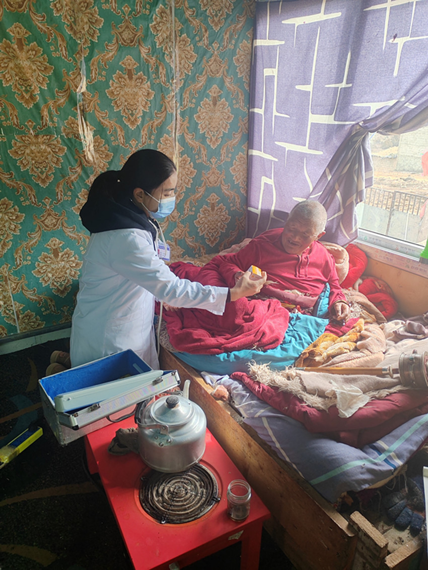 白玉縣麻邛鄉(xiāng)衛(wèi)生院醫(yī)生沈富瓊深入村民呷拖家開(kāi)展巡診工作。