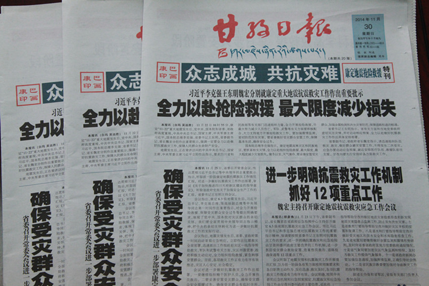 又訊 此外,自康定地震發(fā)生以來(lái),本報(bào)藏漢文報(bào)廣大編采人員發(fā)揚(yáng)連續(xù)作戰(zhàn)的精神,已經(jīng)連續(xù)9天不分白天黑夜地工作,保證了一線有記者的身影,后方編輯及時(shí)發(fā)聲,截止30日,本報(bào)藏漢文報(bào)已經(jīng)出版13期《眾志成城 共抗災(zāi)難》專刊和一期特刊,共計(jì)72個(gè)版面;本報(bào)《康巴傳媒網(wǎng)》自開(kāi)辦網(wǎng)站以來(lái),首次實(shí)現(xiàn)了網(wǎng)站信息即時(shí)更新、滾動(dòng)發(fā)布,網(wǎng)站日上稿量超過(guò)100條,日點(diǎn)擊量均超過(guò)10萬(wàn)人次;本報(bào)微信平臺(tái)則采用短平快的方式,第一時(shí)間發(fā)布最新資訊,引導(dǎo)公眾情緒,傳播黨委政府的聲音,微信日點(diǎn)擊和轉(zhuǎn)發(fā)量超過(guò)2萬(wàn)人次;除此之外,本報(bào)承辦的手機(jī)報(bào)也發(fā)揮了巨大的作用。