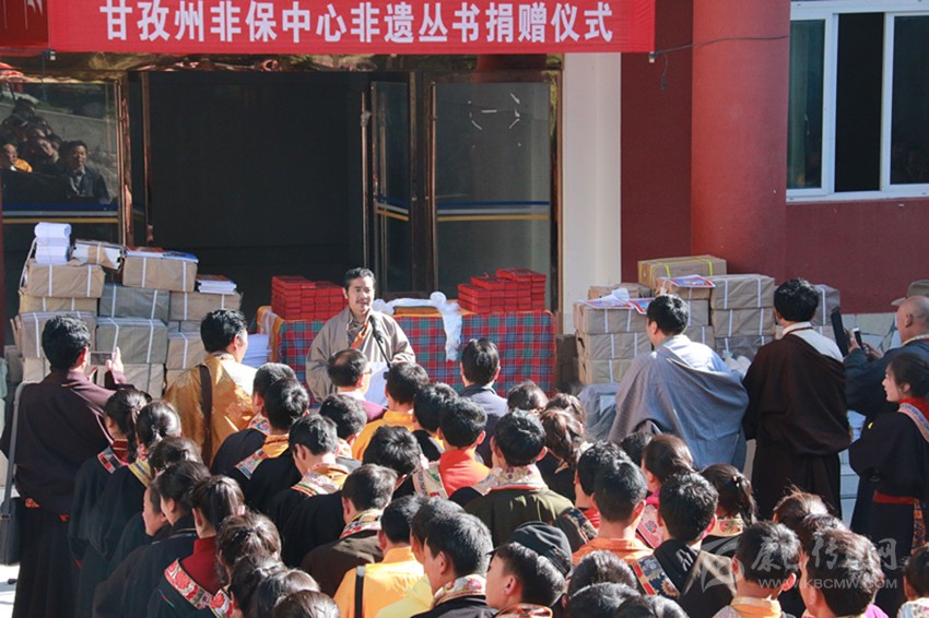 (本網(wǎng)記者 益西貢布 攝影報道)5月13日,州文化館非遺保護中心非遺叢書捐贈儀式在四川省藏文學校舉行。此次捐贈的700多冊非遺書籍和畫冊是十多年來州文化館非遺保護中心通過各種渠道收集、整理、出版的非遺叢書。圖為捐贈儀式現(xiàn)場。