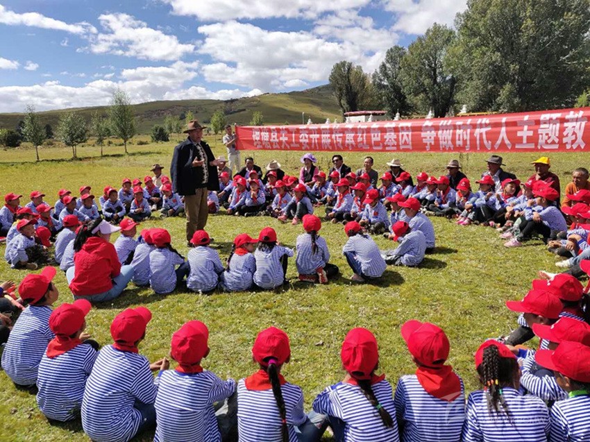 本網訊 9月4日,理塘縣甲洼鎮(zhèn)向陽寺外的草壩上,鎮(zhèn)小學的全體師生津津有味地聽“五老”志愿者講先烈們的故事和翻身農奴如何過上幸福生活的鮮活事例。