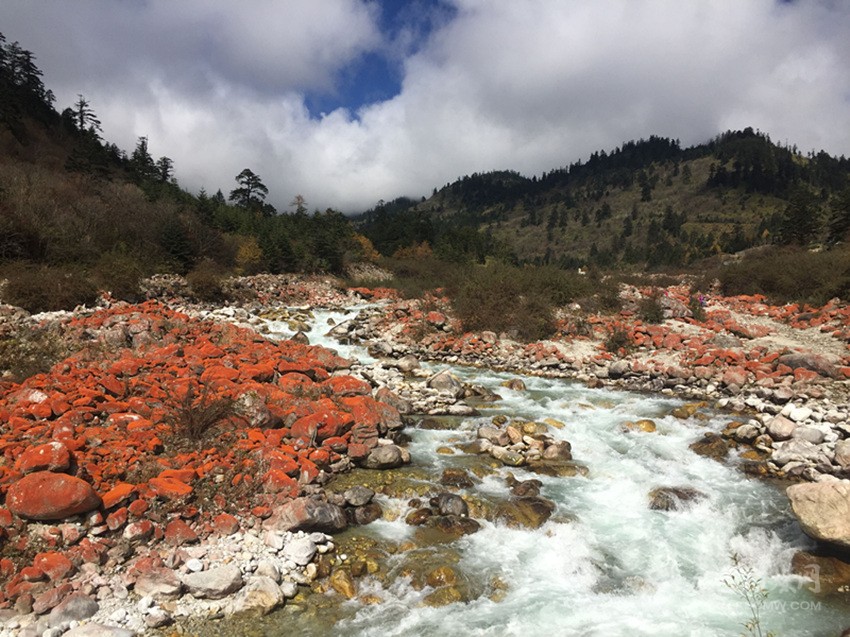 據(jù)景區(qū)工作人員介紹,中國紅石公園景區(qū)是大海螺溝景區(qū)的重要組成部分,這里的紅石,實際上是石頭上長滿了喬利橘色藻。如同給石頭披上一件美麗的紅色外衣,堆積在山谷中、河流旁,宛如跳躍流動的音符,在雪山的映襯下,規(guī)模宏大,氣貫長虹,瑰麗壯美,堪稱為“世界的紅色公園”。