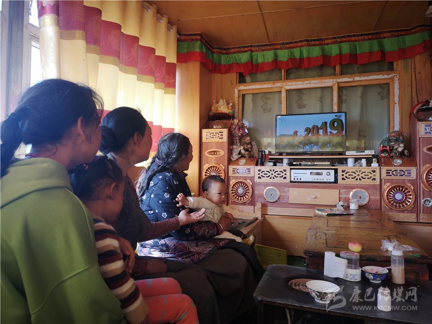甘孜縣斯俄鄉(xiāng)日安村貧困戶(hù)布益洛和家人收看慶祝大會(huì)直播。