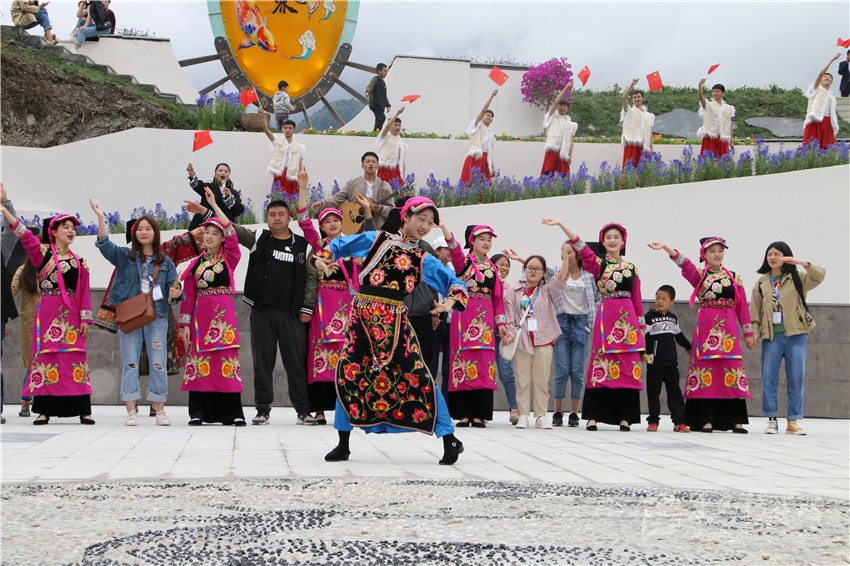 圖為康定市麥崩鄉(xiāng)日央村魚(yú)通官寨開(kāi)園儀式上,游客和村民一起表演。