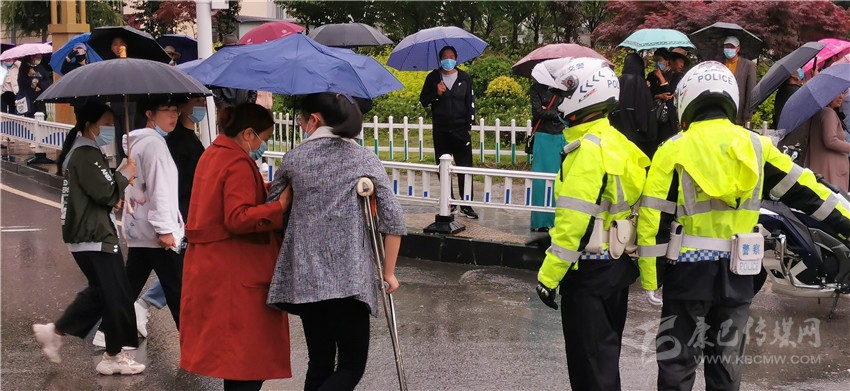 這邊剛幫助考生尋回遺失的準(zhǔn)考證,那邊一名杵著拐杖的考生引起了執(zhí)勤交警的注意,這時這名考生在家長的攙扶下正準(zhǔn)備過馬路,交警見狀,立即上前為其疏導(dǎo)交通,開辟出綠色通道。記者了解到,這名考生叫段尚玲,兩周前意外摔傷了腿,這給她的應(yīng)試之路帶來了不少麻煩,幸好在交警的幫助下,她安全順利地進(jìn)入了考場。