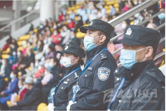 “請(qǐng)出示你的身份證,配戴好口罩?!薄按蟾缒阏义e(cuò)方向了,你是往那邊走?!薄鞍?,你的位置是往左邊走?!薄诒遍T體育場(chǎng),民警除了安保執(zhí)勤以外,還幫助行動(dòng)不方便的群眾找尋座位,或?yàn)樽稍兊娜罕姶鹨山饣蟆?/p>
