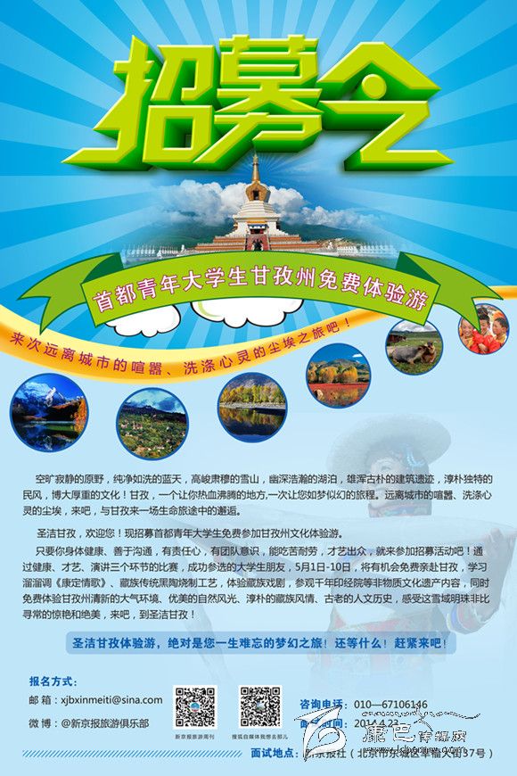本網訊(本網記者)為進一步宣傳展示甘孜州的康巴文化積淀與旅游特色,州委、州政府將舉辦“圣潔甘孜,走進北京”的文化旅游周宣傳活動,在宣傳周前期推出了一個亮點活動,就是面向首都各高校公開招募一批青年大學生赴甘孜州體驗生活,讓他們走出都市,感受生態(tài)甘孜的藍天白云,感悟和諧甘孜的幸福文明,以他們的親身經歷為樣本案例,見證新甘孜的獨特魅力。
