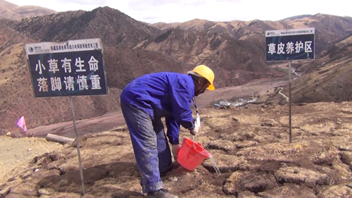 據介紹,施工前工作人員先將施工區(qū)域的原生草皮進行剝離,移至他處并進行養(yǎng)護,待施工結束后,再將剝離的草皮移回原處進行回鋪;對開挖造成地表植被破壞的地段播撒適合高原生長的草籽,直到長出綠草?,F場的施工人員介紹說,塔基開挖過程中,先將熟土(表土)、生土分開堆放,并采取隔離(鋪設棕墊等)、攔擋、覆蓋等措施,回填時先將生土回填,熟土最后置于表面,以保證植被的恢復。