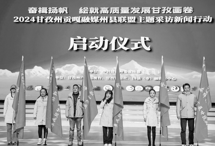 本網(wǎng)訊 為著力建設(shè)習(xí)近平文化思想涉藏地區(qū)生動實(shí)踐地的“甘孜樣板”,奮力打造中華文明和康巴文化傳播的“甘孜窗口”,努力創(chuàng)造宣傳思想文化工作的“甘孜品牌”,2月28日,以“奮楫揚(yáng)帆 繪就高質(zhì)量發(fā)展甘孜畫卷”為主題的甘孜州貢嘎融媒州縣聯(lián)盟主題采訪新聞行動在州廣播電視臺文藝演播大廳啟動,一場圍繞中心、服務(wù)大局的新聞實(shí)踐,分批推進(jìn)、貫穿全年的統(tǒng)一行動,新聞戰(zhàn)線協(xié)同聯(lián)動、各展其長的創(chuàng)新探索至此拉開帷幕。