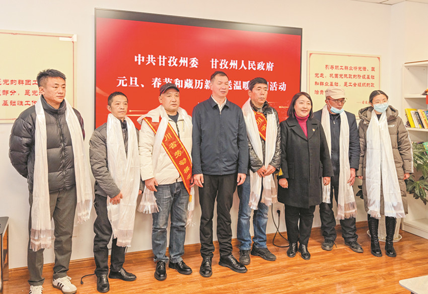 州委常委、統(tǒng)戰(zhàn)部長、州總工會主席游祥飛( 左四 )慰問勞模和困難職工。