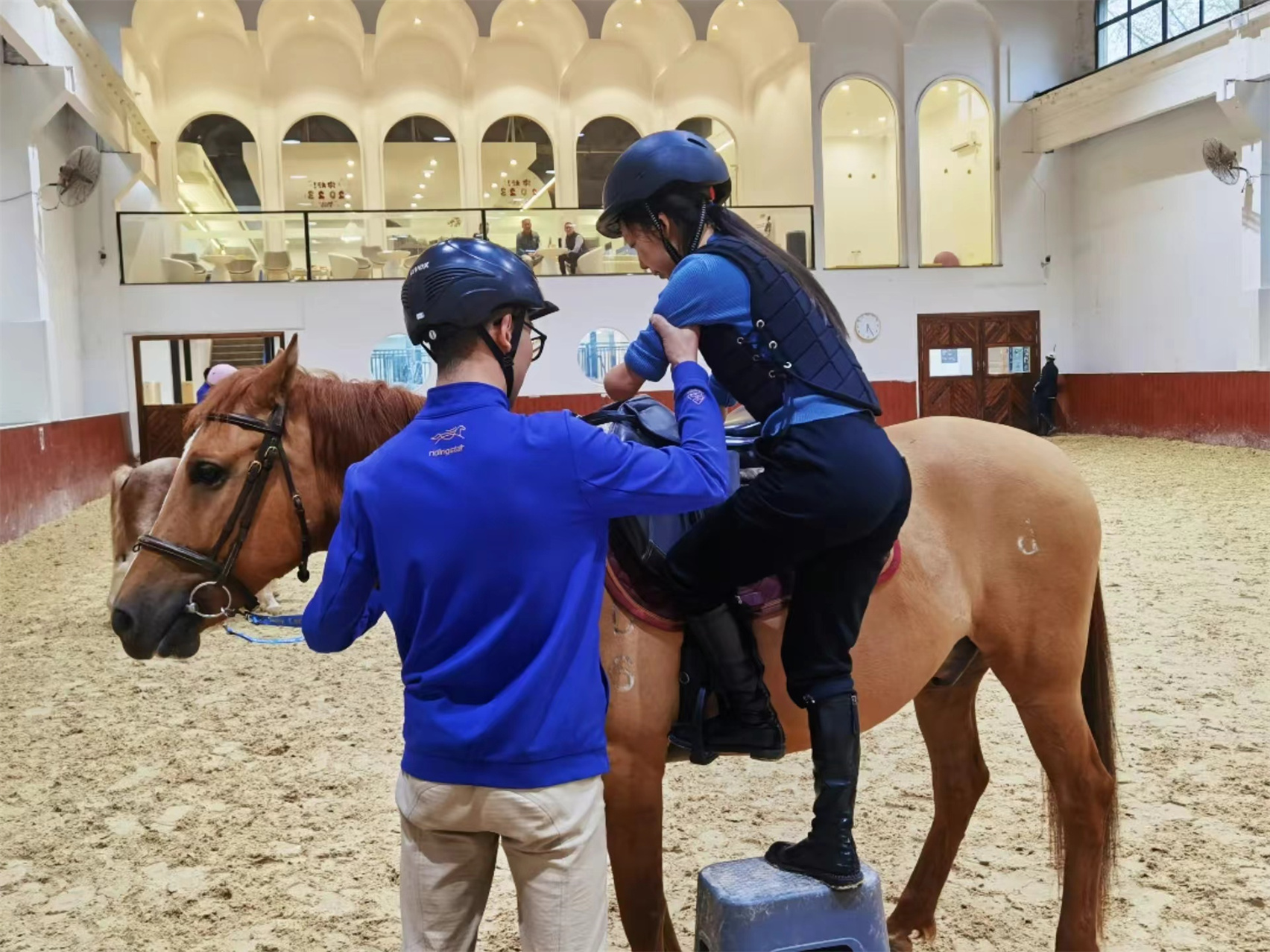 許方燕在教練幫助下登馬參訓。