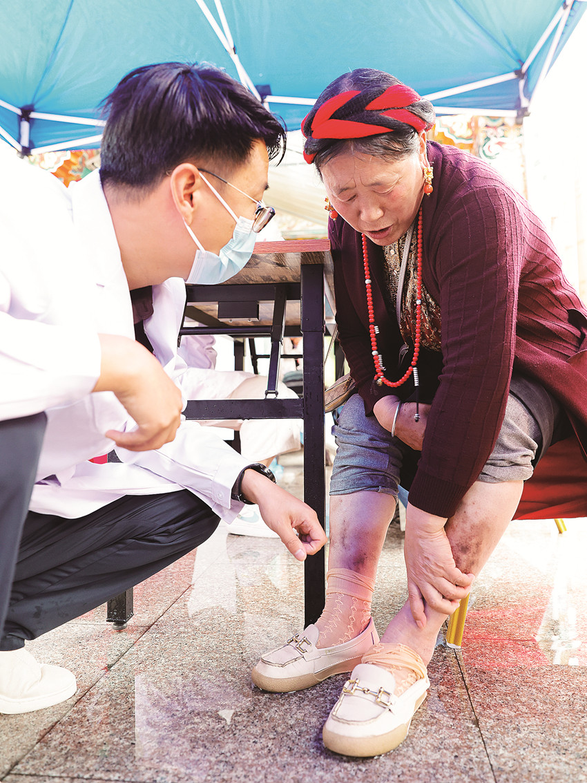 排隊(duì)、分診、診斷……在巴塘縣義診現(xiàn)場(chǎng),每一位身著白衣、口音輕柔的醫(yī)生面前都有數(shù)名等待問(wèn)診的群眾。來(lái)自北京大學(xué)第一醫(yī)院、解放軍第八醫(yī)學(xué)中心、北京航天總醫(yī)院等醫(yī)療機(jī)構(gòu),涵蓋腎臟、中醫(yī)、骨科、肝病科疾病等多個(gè)領(lǐng)域的專(zhuān)家團(tuán)隊(duì)正為前來(lái)問(wèn)診的群眾提供多學(xué)科專(zhuān)業(yè)義診服務(wù),并就常見(jiàn)疾病耐心細(xì)致地為患者及家屬答疑解惑。