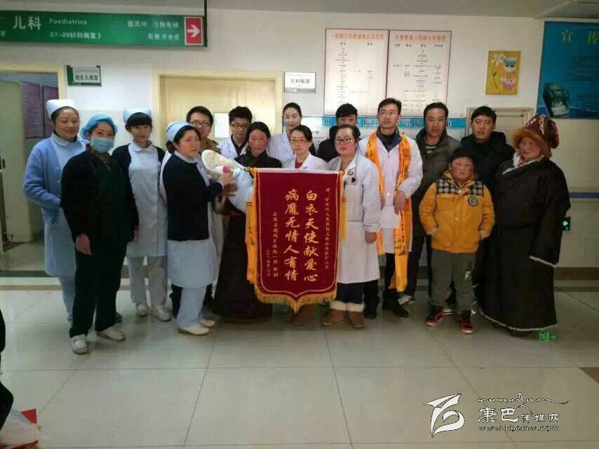 懷抱那胖乎乎、體重已經(jīng)增至2.9公斤的健康小寶寶,小家伙的母親雙眼流出了感激的淚花,她伸出大拇指,不停地“卡措、卡措(謝謝)”點(diǎn)頭致謝。為了表達(dá)感激之情,家人還特地送來(lái)了一面錦旗,上面印著“病魔無(wú)情人有情,白衣天使獻(xiàn)愛(ài)心”。