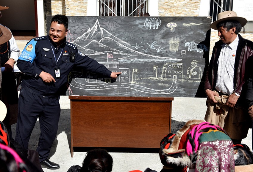 由于轄區(qū)藏族群眾大多都不識(shí)漢字、不會(huì)漢語(yǔ),巴桑呷瓦便將自己的繪畫技藝運(yùn)用到普法教育中,2018年10月,康定市公安局在對(duì)聯(lián)系鄉(xiāng)甲根壩開展精準(zhǔn)扶貧工作時(shí),在全市范圍內(nèi)抽調(diào)了巴桑呷瓦等10名富有群眾工作經(jīng)驗(yàn)的民警,他一邊負(fù)責(zé)沙德鎮(zhèn)派出所日常工作,一邊負(fù)責(zé)兼職扎日村精準(zhǔn)扶貧工作,用繪畫的方式為牧民群眾描繪脫貧致富夢(mèng)。他把國(guó)家的相關(guān)法律法規(guī)、民族政策和惠民工程政策吃透并制作成故事性強(qiáng)、通俗易通的簡(jiǎn)筆畫冊(cè)向老百姓解讀、宣講。在巴桑呷瓦妙趣橫生、詼諧幽默的“授課”下,深?yuàn)W的法律政策變得淺顯易懂?!八漠嬓蜗笊鷦?dòng),接地氣,有我們的生產(chǎn)生活場(chǎng)景,我們喜歡看,他的講解幽默風(fēng)趣,我們聽得懂,只要他一下來(lái),村民都圍在他的身邊,舍不得離開?!痹沾宓拇迕褚呀?jīng)把這位“畫家”警察當(dāng)作了自家人。