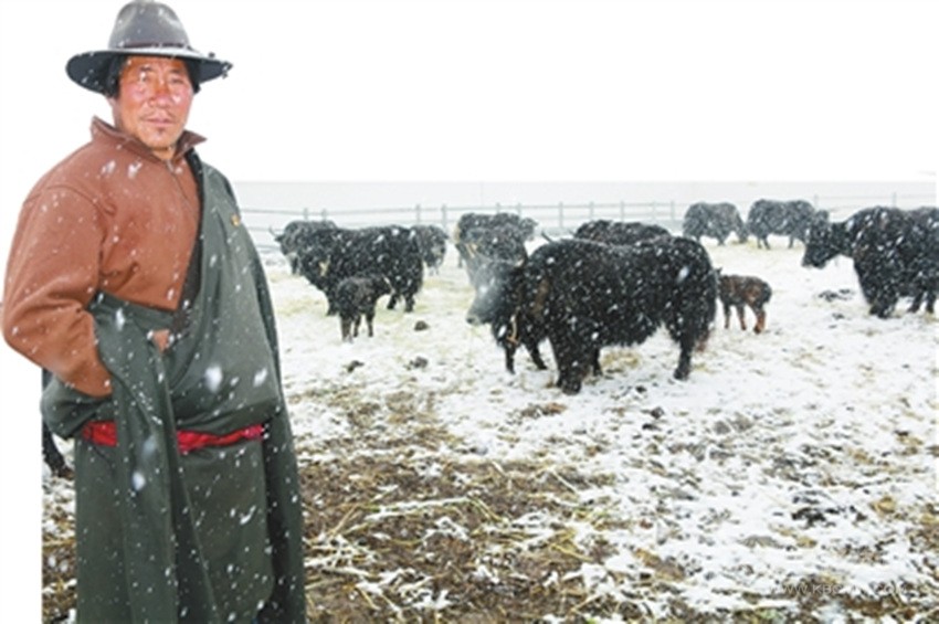5月8日,甘孜縣達(dá)通瑪片區(qū)大雪飛揚(yáng)。在茶扎鄉(xiāng)銀多村集體牧場,放養(yǎng)人員格絨正在給上百頭牦牛喂草料,他喜滋滋地說,通過牧民儲(chǔ)備和農(nóng)牧農(nóng)村局提供草料的方式,牦??梢园踩^冬。銀多村現(xiàn)代化集體牧場合作社成立一年多的時(shí)間,共出欄牦牛16頭,總收益67380元,除去20%預(yù)留金,村民有了一定的收入,而作為放牧人員,他管理了52頭牦牛,一年有1.2萬元的收入。