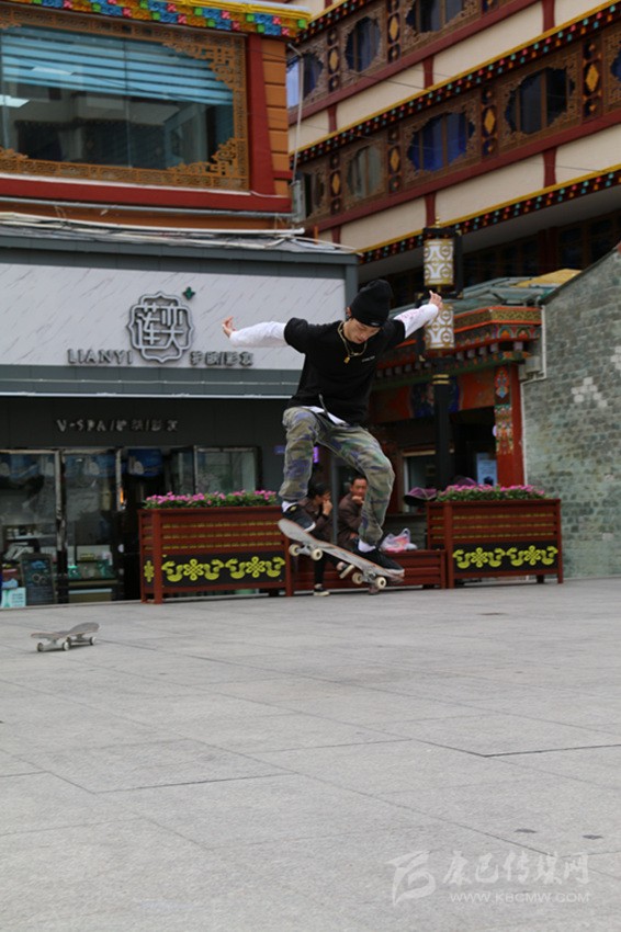 6月22日,世界滑板日,康定市情歌廣場(chǎng),一群滑板少年舉著“GOTTA’318”大旗,正在演繹精彩。他們時(shí)而團(tuán)隊(duì)作業(yè),時(shí)而單兵作戰(zhàn),時(shí)而爭(zhēng)相競(jìng)技,時(shí)而相互逗樂(lè)。當(dāng)他們舞動(dòng)旗幟,蛇形而行,呼嘯而來(lái),你會(huì)感受到蓬勃的青春氣息撲面而來(lái);當(dāng)他們帶板直上滑桿,倏忽而過(guò)時(shí),你會(huì)在那一剎那感到記憶一陣空白,然后發(fā)出一聲驚嘆;當(dāng)他們瞬間起跳,在空中360度轉(zhuǎn)體,然后像雄鷹一樣翱翔時(shí),你會(huì)感覺(jué)歲月易老,對(duì)青春只有追憶;而當(dāng)他們競(jìng)技“爭(zhēng)高”“望遠(yuǎn)”時(shí),你會(huì)感受到那鍥而不舍的奮斗精神充盈你的脈管……