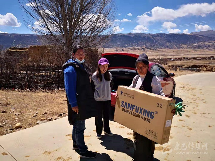 次仁布扯(左一)為困難群眾送去捐助物資。